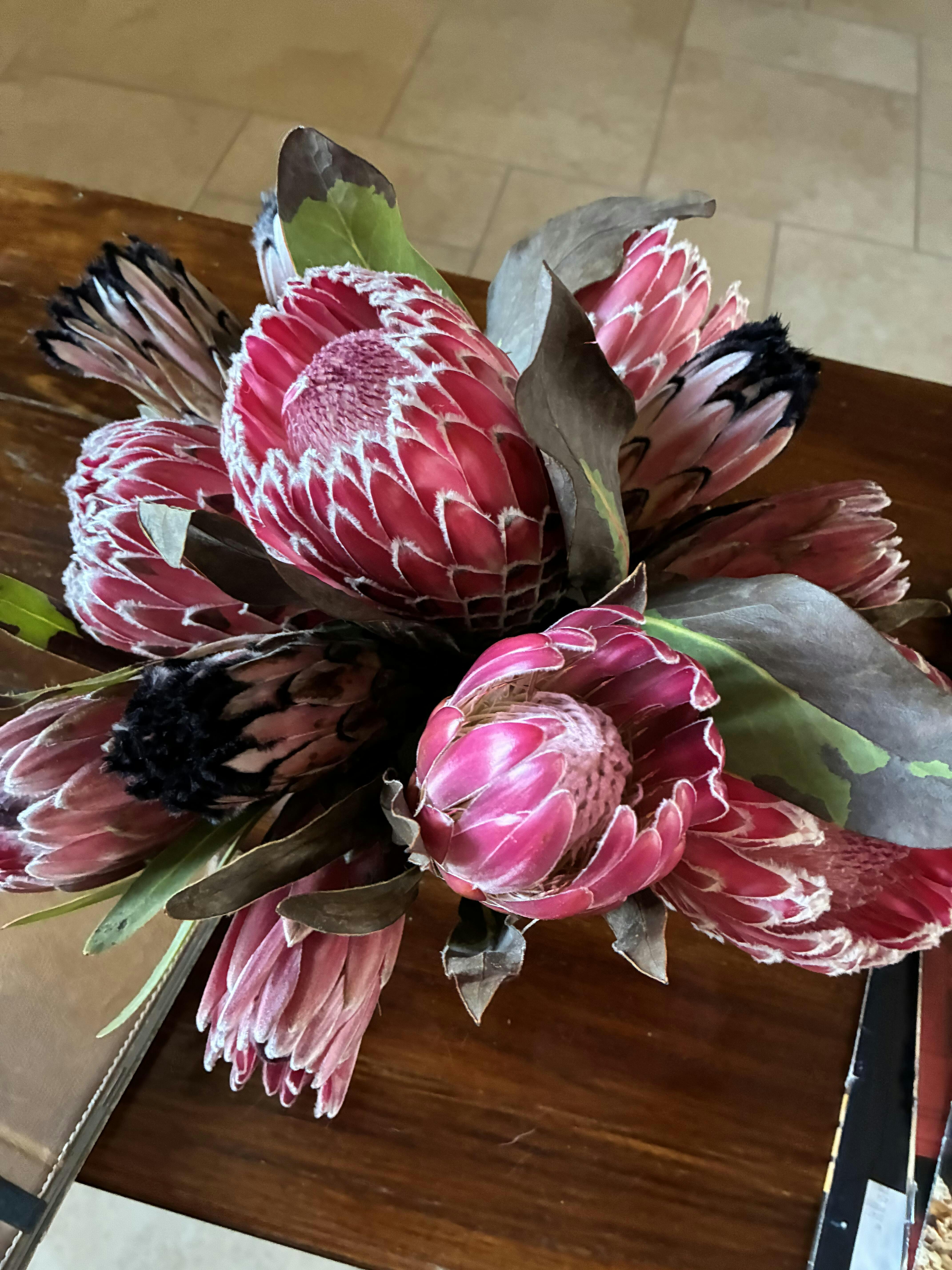The Protea flower is an excellent gift of love, hope, gratitude, and celebration. Its bold and sculptural beauty will brighten any room and make a wonderful statement for any occasion. The Protea flower is also used in dry flower arrangements, so the stem and flower will last for an extended amount of time.